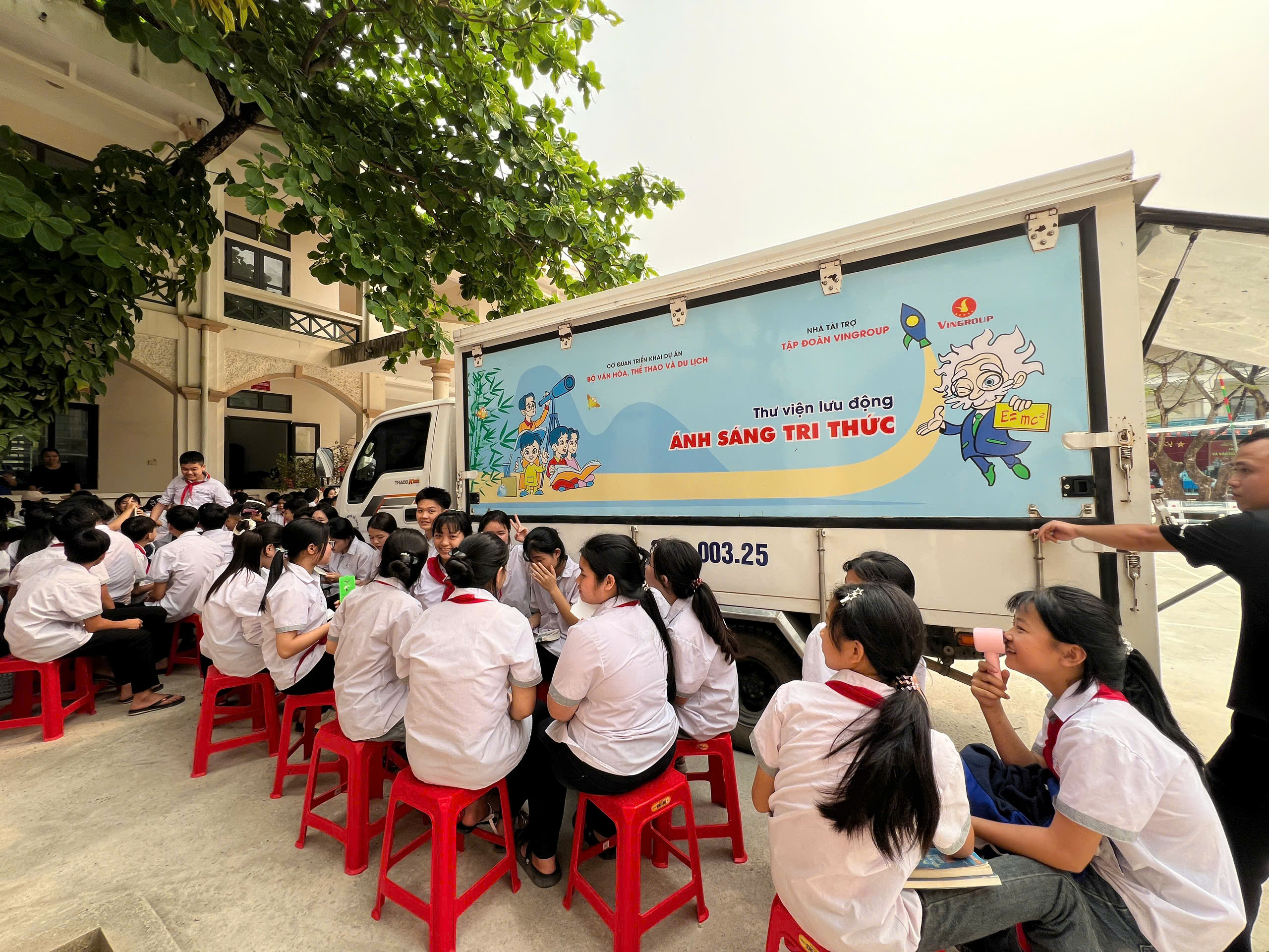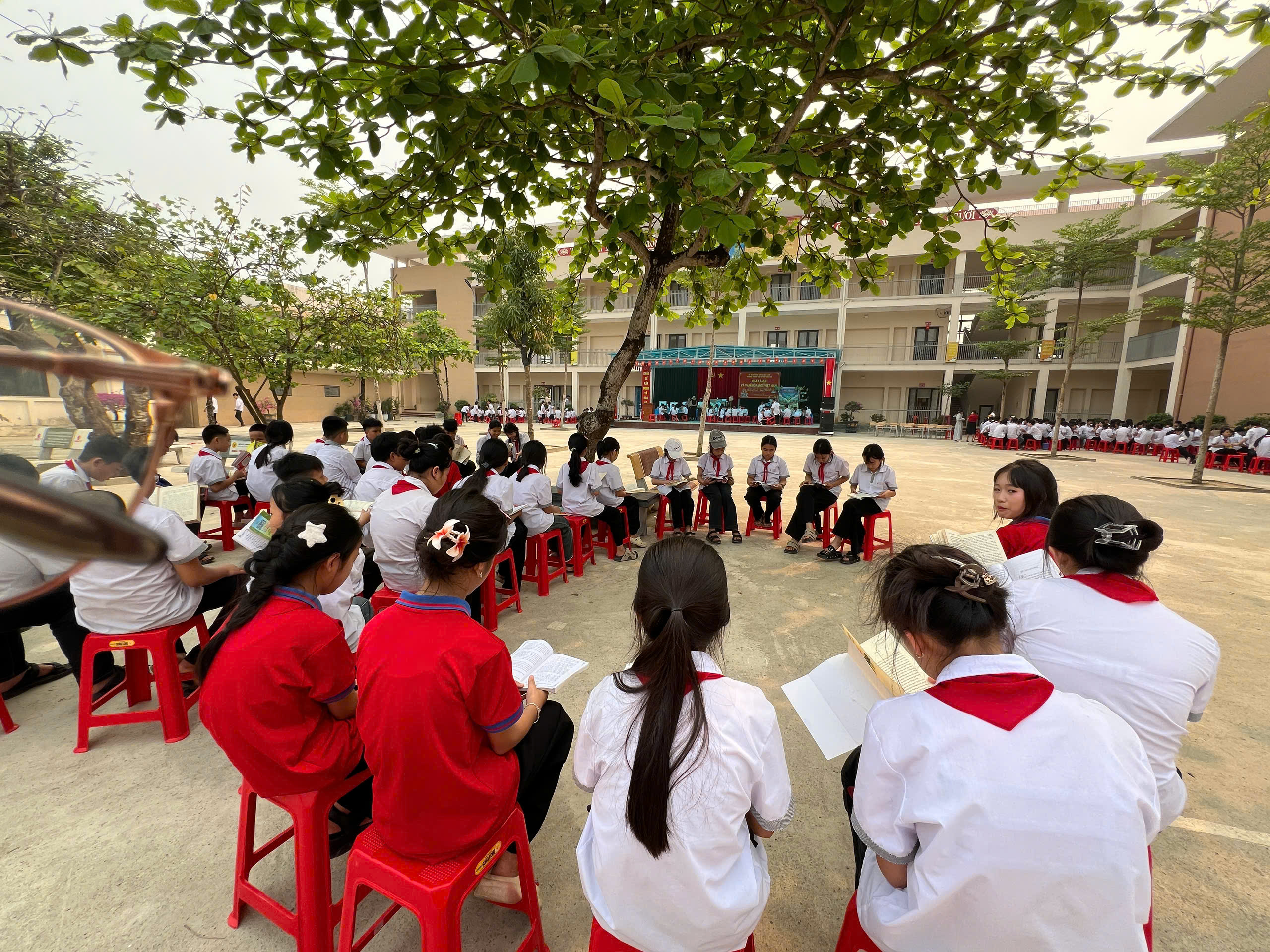 🎉Phần đọc sách tại sân trường của các lớp đã tạo ra không gian đầy hứng khởi. Các em được trực tiếp tiếp cận với những cuốn sách trên xe thư viện lưu động của Cán bộ thư viện tỉnh Ninh Bình. Đây có lẽ là phần tham gia hào hứng và bổ ích nhất đối với các em.