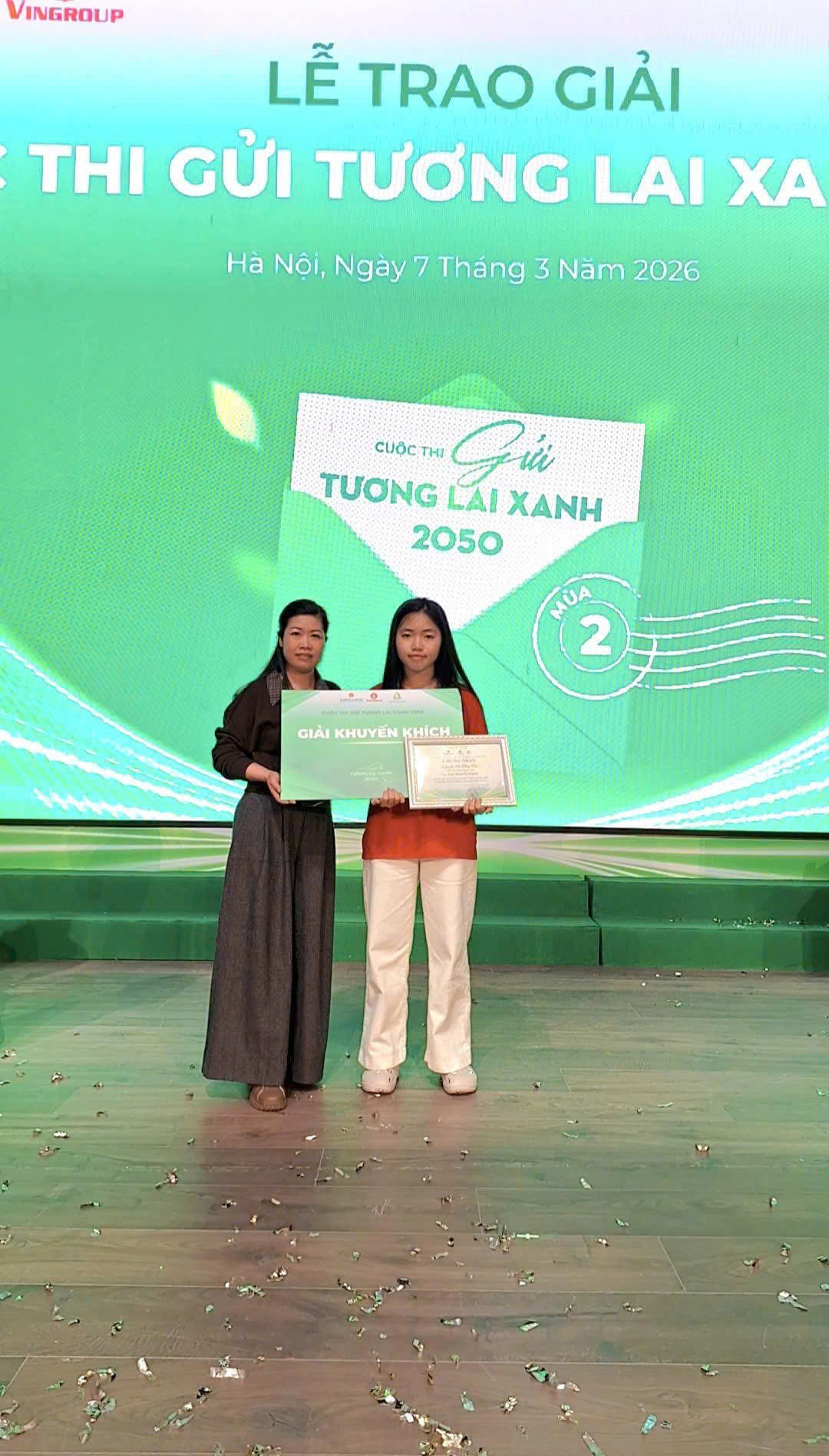 Bài dự thi của em Nguyễn Thị Thủy Tiên dưới sự hướng dẫn trực tiếp của cô giáo Nguyễn Thị Minh Hiên – Giáo viên môn Mĩ Thuật – đã vượt qua hơn 40.000 sản phẩm dự thi trên toàn quốc để lọt vào top 450 tác phẩm được lựa chọn tham gia vòng phỏng vấn của cuộc thi. Sau vòng đánh giá tiếp theo, tác phẩm của em tiếp tục được lựa chọn vào top 300 bài dự thi xuất sắc bước vào vòng chung kết. Với ý tưởng sáng tạo cùng thông điệp ý nghĩa về bảo vệ môi trường và xây dựng một tương lai xanh, bền vững, bài dự thi của em đã xuất sắc đạt giải Khuyến khích cấp Quốc gia của cuộc thi.